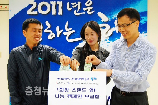한국농어촌공사 충남지역본부(본부장 김태웅)는 5일 오전 서구청과 대전사회복지공동모금회가 공동으로 추진하고 있는 ‘희망 스탠드 업!’ 나눔 캠페인 행사에 직원들이 스스로 모금한 기금을 1차 전달했다.