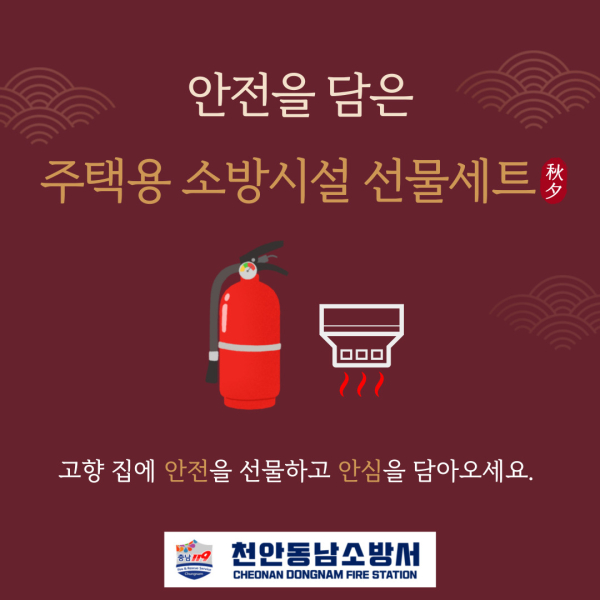 [충청뉴스 박동혁 기자] 천안동남소방서는 추석 명절을 앞두고 주택용 소방시설 설치 촉진을 위해 ‘고향집, 주택용 소방시설 선물하기’ 캠페인을 내달 12일까지 실시한다.