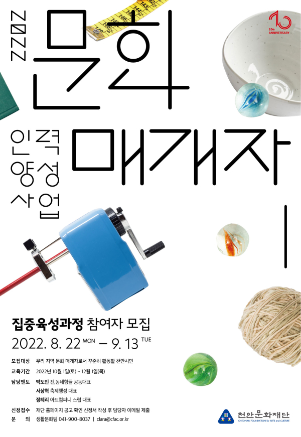 [충청뉴스 박동혁 기자] 천안문화재단이 창의적인 지역문화 인재 발굴을 위한 '2022년 문화매개자 인력양성사업' 중 집중육성과정 참여자 모집에 나섰다.