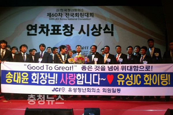 유성JC 송대윤 회장(유성구의회 부의장)은 지난 8일 울산 KBS홀에서 열린 한국청년회의소 제60차 전국회원대회에서 최우수리더쉽을 발휘한 회장에게 수여하는 전국최우수로컬회장상을 수상했다.