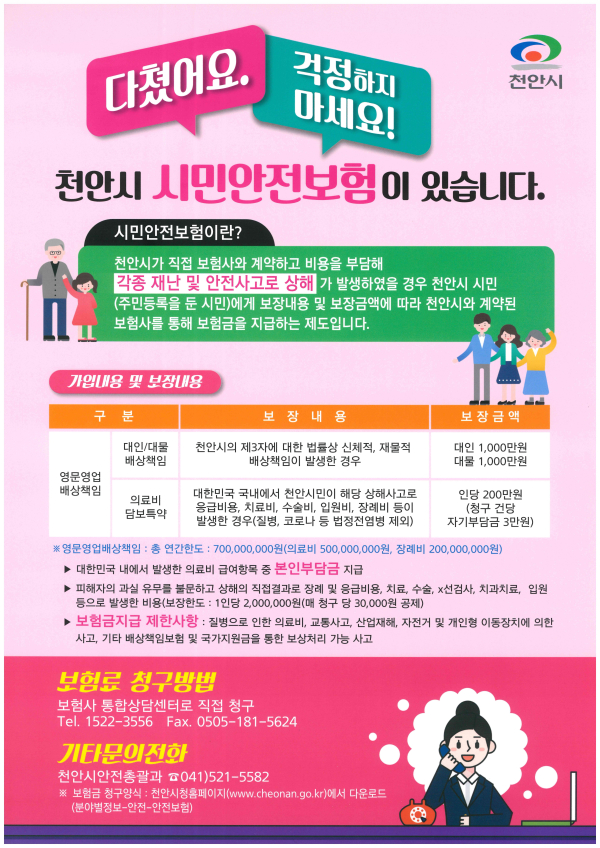 [충청뉴스 박동혁 기자] 충남 천안시가 운영하는 ‘시민안전보험’이 시민의 안전지킴이 역할을 톡톡히 하고 있다.