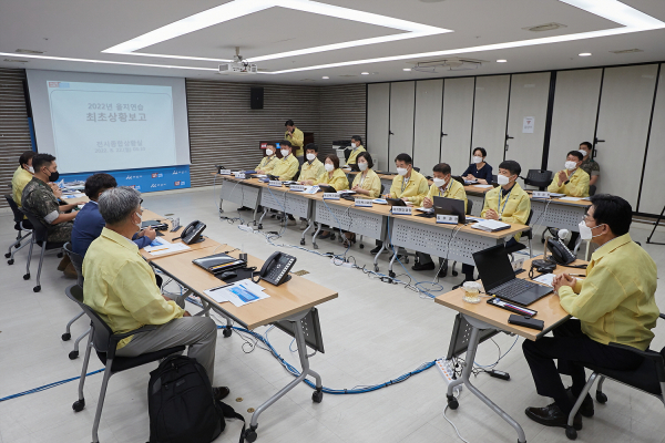 비상소집에 이어 오전 8시 30분에는 시청 20개 부서장과 3585부대 2대대장 등이 참석한 가운데 박경귀 아산시장 주재로 2022 을지연습 최초상황보고회가 개최됐다.