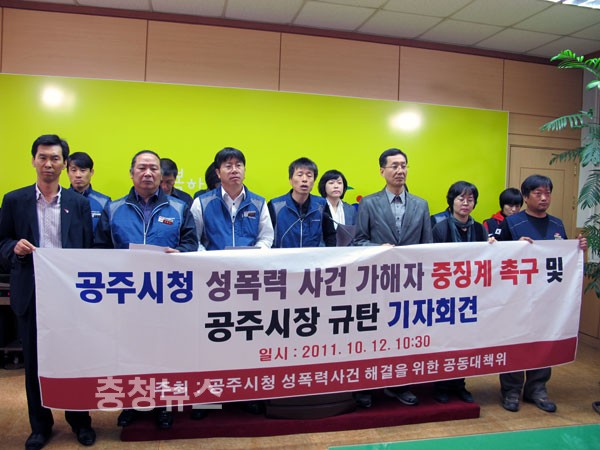 공주시청 성폭력사건 해결을 위한 공동대책위는 12일 오전 충남도청에서 기자회견을 열고 이준원 공주시장에 대해 "성폭력 가해자를 즉각 중징계하고 피해자에게 사과하라"고 촉구했다.