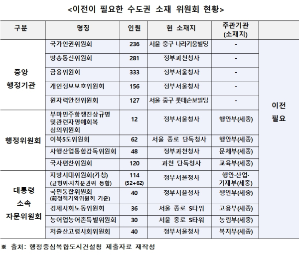 중앙행정기관 5곳(1,133명) 모두 세종에 있는 부처와 업무가 연계되었고, 일반 행정권으로부터 어느 정도의 독립적 지위를 가진 행정위원회 4곳(242명)도 주무부처가 세종에 위치하고 있다. 국가균형발전위원회․자치분권위원회 등과 같은 균형․분권의 상징성이 높은 대통령 소속 자문위원회 5곳(260명)의 세종 이전이 필요하다.