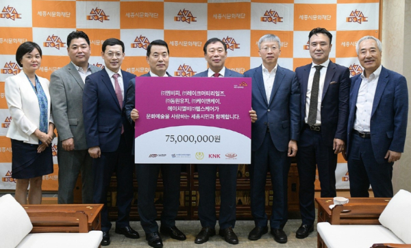 [충청뉴스 최형순 기자] 세종시 5개 기업이 31일 세종시청에서 세종시문화재단(대표이사 김종률)에 문화예술후원금 7천5백만 원을 전달했다.