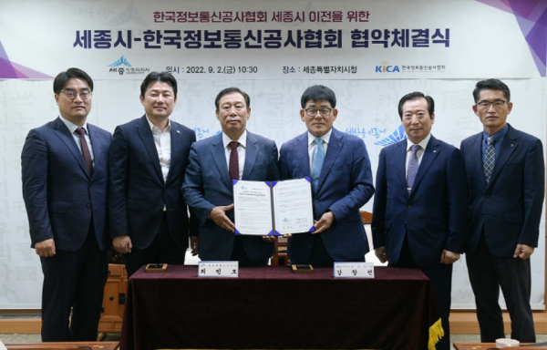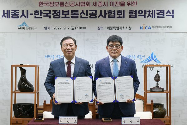 세종특별자치시(시장 최민호)는 2일 세종시청 접견실에서 "최민호 시장과 강창선 한국정보통신공사협회 중앙회장이 참석한 가운데 ‘한국정보통신공사협회 세종시 이전 업무협약’을 체결했다"고 밝혔다.