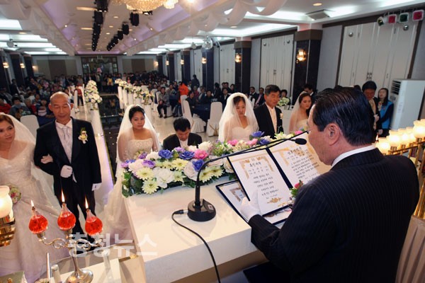 ▲ 6쌍의 커플들이 300여명의 하객들에게 축하를 받으며 결혼식을 올리고 있다.