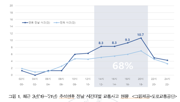 시간대별로 보면 연휴 전날 사고건수가 최근 일평균 사고건수보다 많게 나타났다. 특히, 오후 6시~8시 사이에 가장 집중, 오후 시간대(12시~20시) 교통사고가 68%를 차지하는 것으로 나타났다.