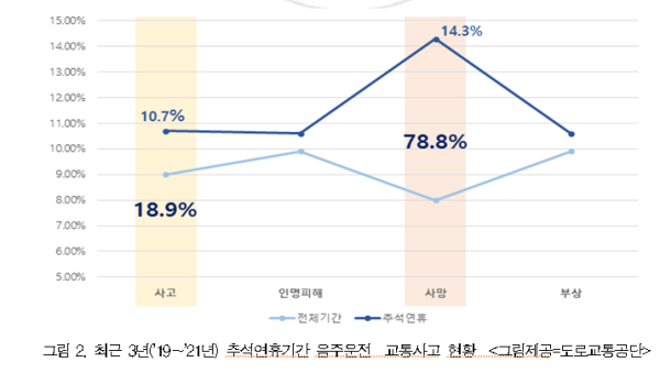음주운전 사고비율은 평소(9%) 대비 18.9%(추석연휴 10.7%) 높았고, 음주운전으로 인한 사망자도 평소(8%)보다 78.8%(추석연휴 14.3%) 높아 연휴기간 가족‧친지와의 술자리로 인한 음주운전 사고발생률과 위험성이 더 높았다.