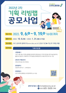 DSC 지역혁신플랫폼 미래리빙랩센터는 오는 19일까지 지역현안 발굴 및 해결 사업을 지원하는 ‘2022년도 제2차 기획리빙랩 사업’의 참가팀 50개 팀을 모집한다.