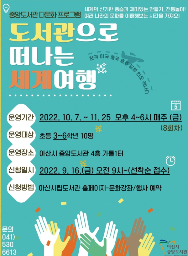 [충청뉴스 박동혁 기자] 충남 아산시가 오는 16일부터 세계 곳곳의 다문화를 이해할 수 있는 ‘도서관으로 떠나는 세계여행’ 프로그램 참여자를 모집한다.