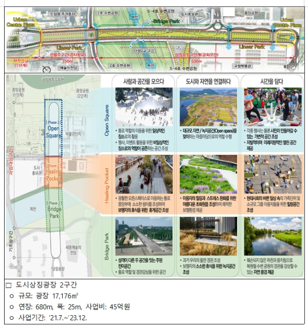 나성2교 상부에 위치한 교량구간(Bridge Park)은 보행자의 소소한 휴식을 위한 공간으로 조성하고, 특화쉼터구간(Healing Pocket)은 이용자의 스트레스 완화를 위한 초화원을 제공, 광장구간(Open Square)은 각종 행사는 물론 시민이 만들어갈 수 있는 가변적 공간으로 조성할 예정이다.