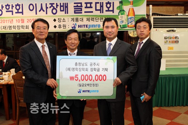 하이트진로(주) 대전지점(지점장 오양균)은 지난 20일 제4회 (재)명학장학회 이사장배 골프대회에서 명학장학기금 5백만원을 전달했다.