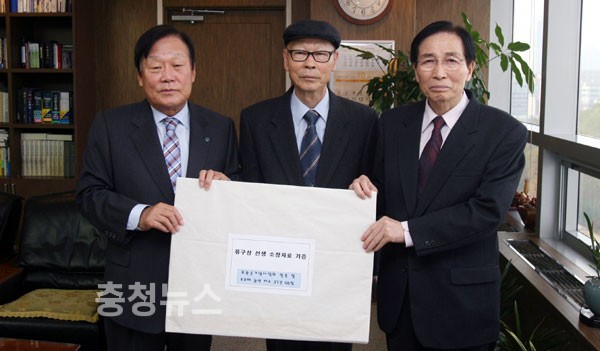 ▲ 성무용 천안시장이 류구상씨로부터 유물들을 기증 받고 있다.