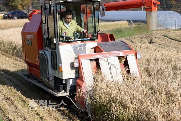 ▲ 이기원 계룡시장이 직접 콤바인은 운전하고 있다.