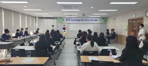 이날 의견수렴회는 천안학군 초등학교 학부모 대표 32명과 교육국장, 중등교육과장, 행정과장, 초·중학교 교장, 행정실장 등 8명이 참석했으며, 2023학년도 중학교 신입생 배정(안)에 대한 의견을 나눴다.