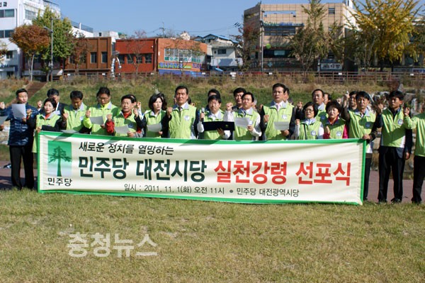 민주당 대전시당(시당위원장 박범계)은 1일 목척교 하상에서 ‘새로운 정치를 열망하는 3대 실천강령 선포식’을 개최한 가운데 시당위원장을 비롯한 지역위원장들이 하나의 목소리로 변화와 혁신을 외쳤다.