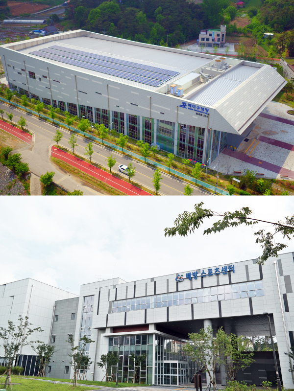 배미수영장(위)과 배방스포츠센터(아래) 전경