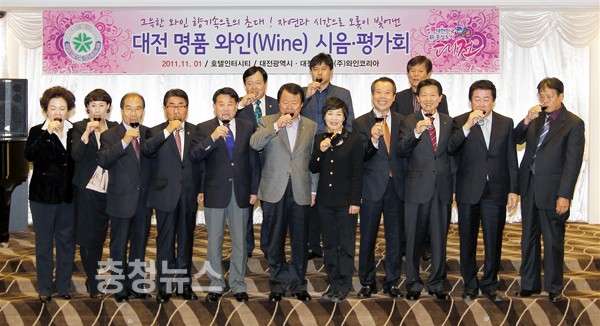대전지역 생산 포도로 만든 와인 시음평가회가 1일 호텔인터시티 에메랄드 홀에서 염홍철 대전시장을 비롯해 이상태 시의회의장, 김종화 농협중앙회 대전지역본부장, 윤병태 와인코리아(주)대표 등 100여 명이 참석한 가운데 열렸다.