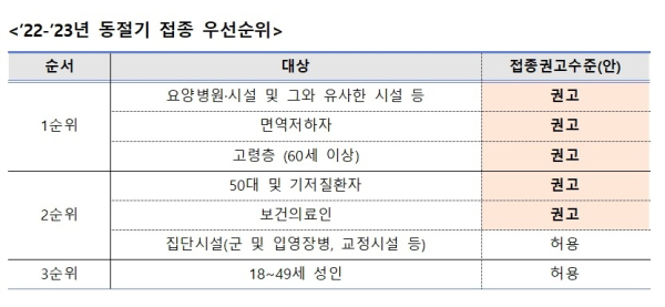 현재 우선 접종 대상자인 면역저하자, 60세 이상 고령층, 감염 취약 시설 입소·종사자를 대상으로 사전 예약이 진행 중이며, 2·3순위 대상자는 잔여 백신을 통한 당일 접종이 가능하다.