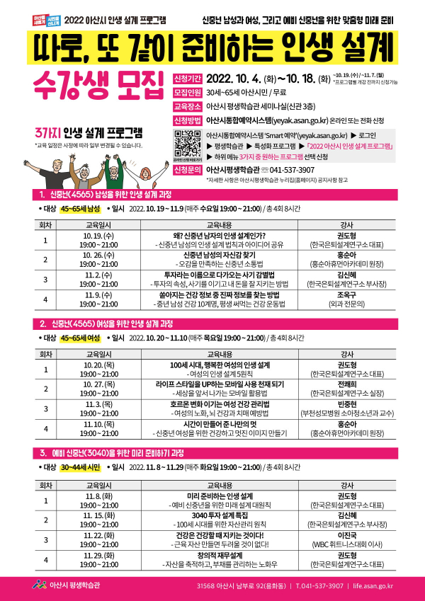 최광락 아산시평생학습관장은 “성별과 나이에 맞는 생활밀착형 인생 설계를 통해 앞으로의 삶을 준비하는 데 도움을 줄 수 있는 이번 프로그램에 시민 여러분의 많은 참여를 바란다”고 말했다.