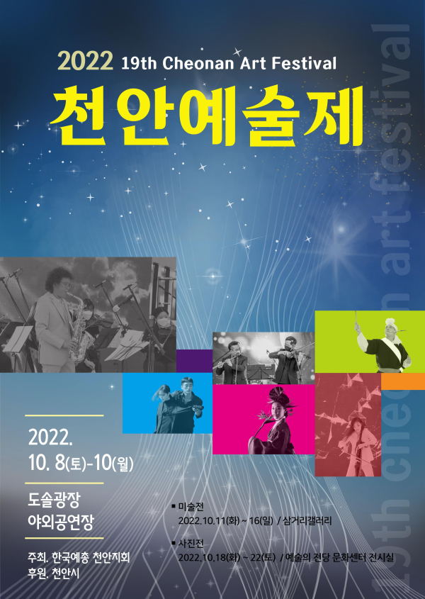한국예총 천안지회는 오는 8일부터 22일까지 천안도솔광장과 삼거리갤러리, 천안예술의전당 등에서 ‘2022 제19회 천안예술제’를 개최한다고 5일 밝혔다.