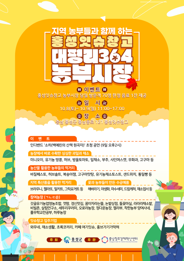 [충청뉴스 박동혁 기자] 충남창조경제혁신센터(이하 충남센터)가 오는 8일~9일 양일간 홍성잇슈창고를 활용한 ‘대평리 364 농부시장’을 개최한다.