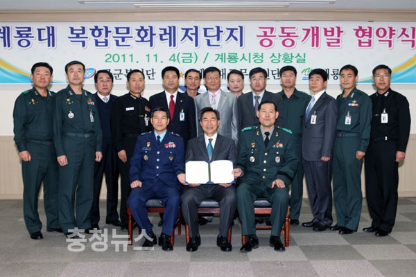 계룡시(시장 이기원)는 4일 계룡시청 상황실에서 이기원 계룡시장, 박대섭 국군복지단장, 정경두 계룡대근무지원단장 등 관계자 16명이 참석한 가운데 계룡시와 국군복지단, 계룡대근무지원단간의 ‘계룡대 복합문화레저단지’ 공동개발 협약식을 개최했다.