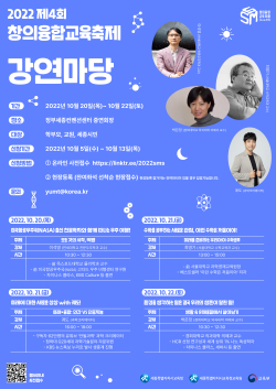 이번 강연마당은 학부모, 교원, 세종시민이라면 누구나 참여할 수 있다. 신청은 10월 13일까지 창의융합교육축제 안내 링크(https://linktr.ee/2022sms)를 통해 온라인 사전접수가 가능하며, 강연 당일 잔여 좌석에 한해 선착순으로 현장등록도 가능하다.