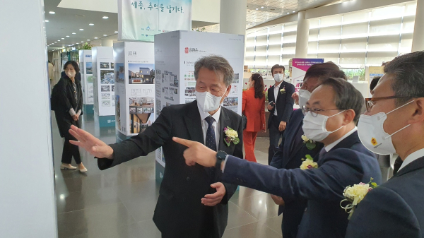 좌로부터 특별전시관에 마련된 건축작품 전시회를 둘러보고 있는 김승태 세종건축사회장, 고기동 행정부시장, 안신일 시의원