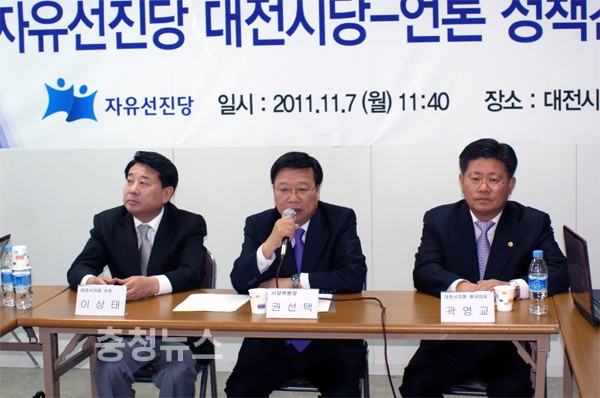 자유선진당 권선택 국회의원이 7일 ‘자유선진당 대전시당-언론 정책 간담회’를 개최한 가운데 2040세대와의 소통을 위해 ‘New 선진청년포럼’을 제안하고, 이 포럼이 인적쇄신을 위한 물꼬가 될 수도 있다고 언급했다.