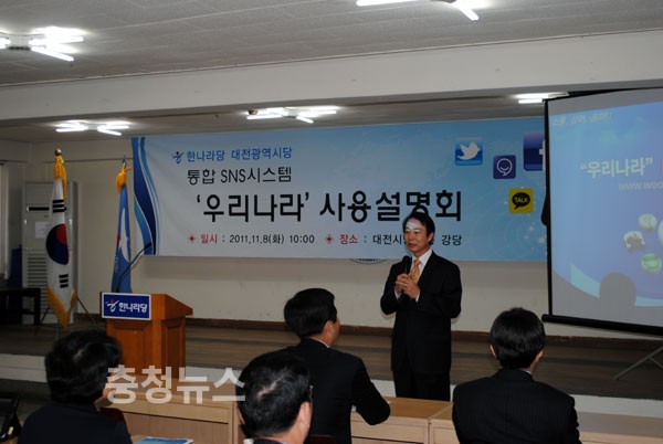 지난 10.26 보궐선거에서 SNS의 파괴력이 입증되면서 정치권의 화두로 떠오르고 있는 가운데 한나라당 대전시당은 8일 통합 SNS 시스템 어플 ‘우리나라’ 시연식을 갖고, 대전 지역에서 가장 발 빠르게 대처에 나섰다.