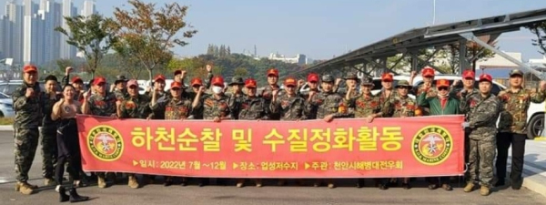 김상식 해병대 천안전우회장은 “시민 삶의 질 향상을 위해 이번 활동을 추진했다”며 “앞으로도 시의 요청에 적극 협조해 관내 저수지 환경정화와 재난재해 시 인명구조 활동에 앞장서겠다”고 밝혔다.