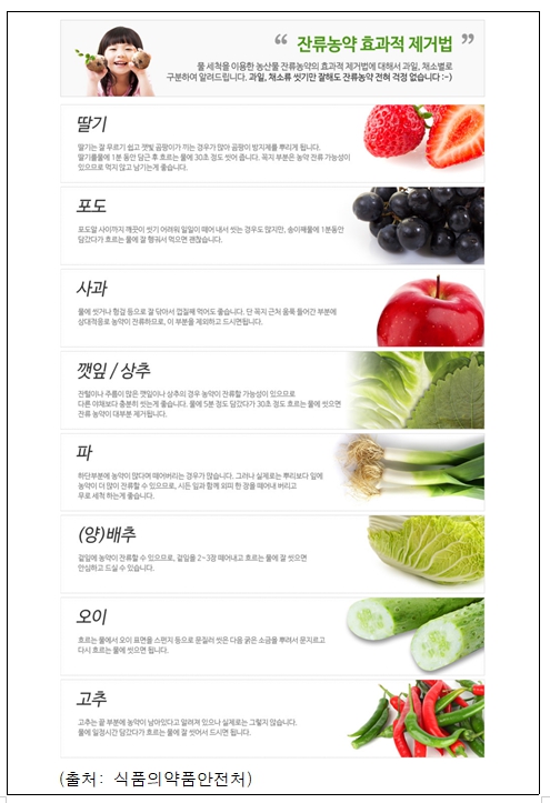 농산물은 물 세척만으로도 농약이 대부분 제거되기 때문에 안전한 섭취를 위해서는 농산물별 세척요령(붙임 참고)에 따라 꼼꼼히 세척하는 것이 중요하다.