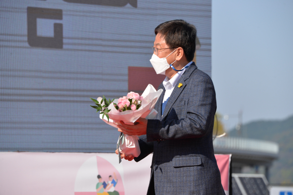 수상자에게 꽃다발을 전달하기 위해 가고 있는 최교진 세종시 교육감