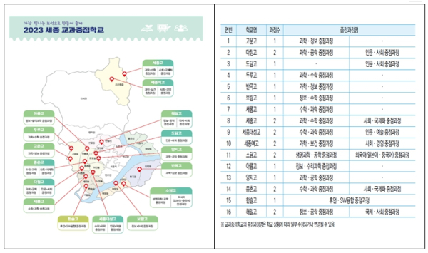 먼저, 2023학년도부터 세종의 16개 모든 일반계 고등학교를 교과중점학교로 운영할 계획으로자연 계열 과정 14개 학교, 인문 계열 과정 8개 학교, 융합 과정 1개 학교 총 23개의 과정이 운영된다.
