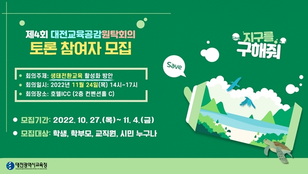 [충청뉴스 이성현 기자] 대전시교육청이 내달 24일 ‘생태전환교육 활성화 방안’을 주제로 개최되는 대전교육공감원탁회의 토론 참여자를 모집한다고 밝혔다.