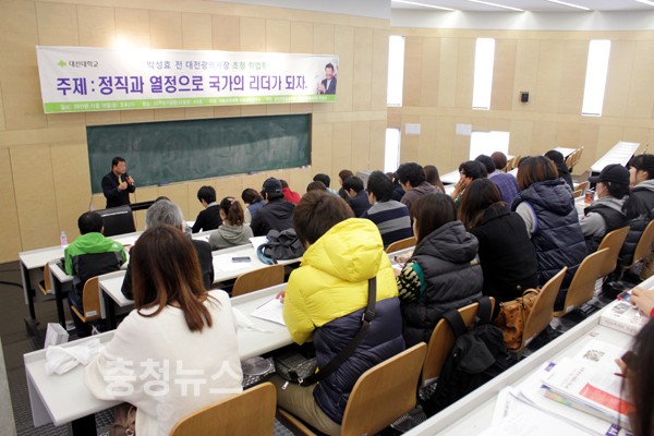 박성효 前 대전시장은 18일 대전대학교 30주년기념관 413호에서 ‘정직과 열정으로 국가의 리더가 되자’는 주제로 외부인사 초청 취업 특강을 실시했다.