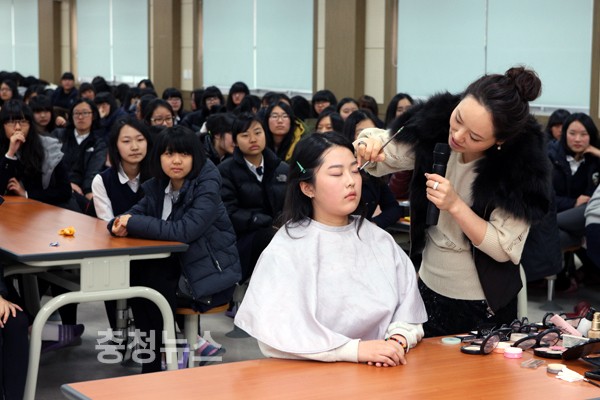 ▲ 유성여고 학생들이 메이크업 과정을 지켜보고 있다.