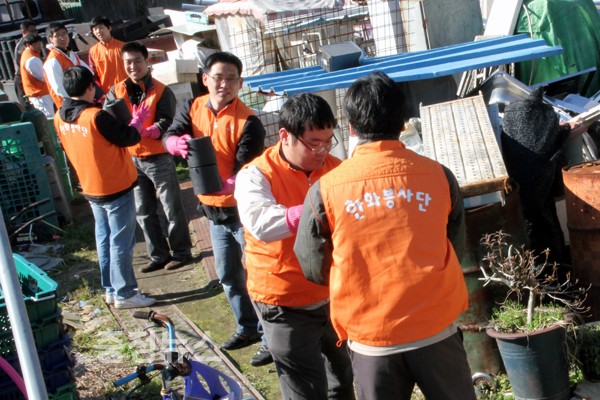 ▲ 한화 대전사업장 봉사단 15명이 연탄을 나르고 있다.