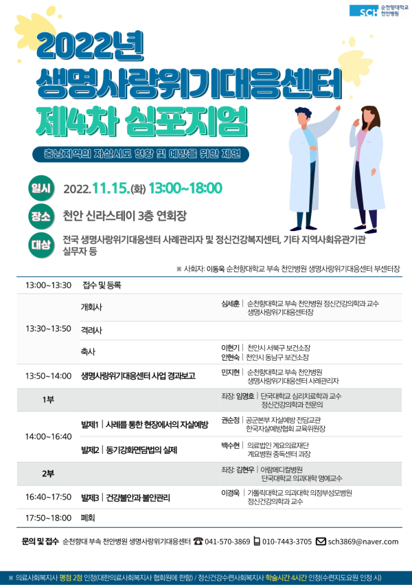 [충청뉴스 박동혁 기자] 순천향대학교 부속 천안병원 생명사랑위기대응센터가 오는 15일 오후 1시 천안 신라스테이 연회장에서 제4차 심포지엄을 개최한다.
