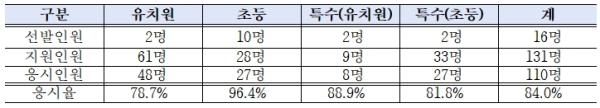 유치원의 경우 2명 선발에 48명이 응시했으며 초등 10명 선발에 27명, 특수(유치원) 2명 선발에 8명, 특수(초등) 2명 선발에 27명이 각각 지원했다.