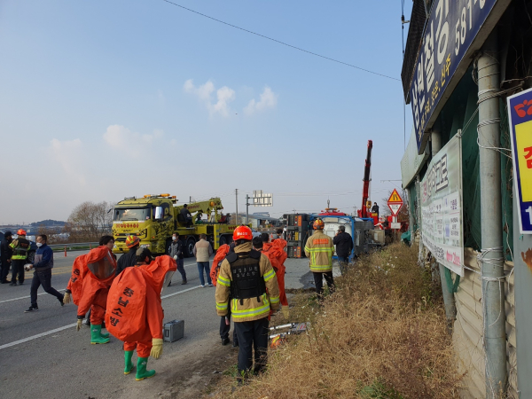 [충청뉴스 박동혁 기자] 15일 오후 1시 26분께 충남 천안시 서북구 성환읍 성환리 대홍교차로에서 화학물질인 수산화나트륨을 실은 25t 탱크로리가 전도되는 사고가 발생했다.