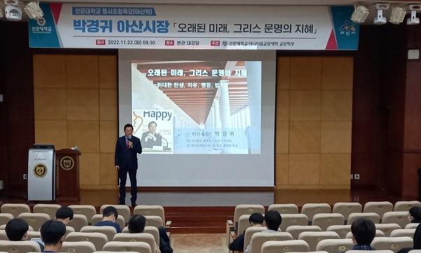 이날 박 시장은 인문학을 접목한 ‘오래된 미래, 그리스 문명의 지혜’를 주제로 아산의 미래 전략에 대해 강의했다.