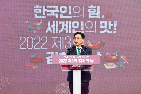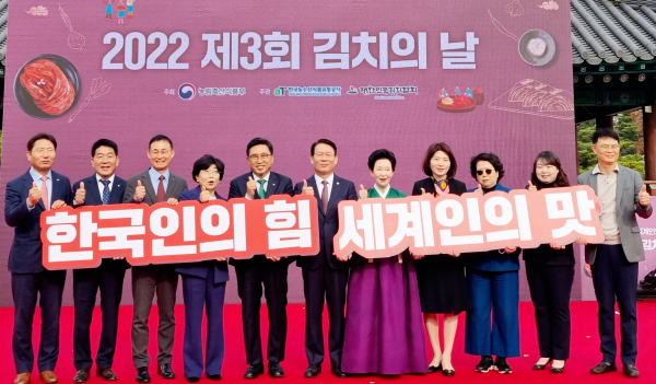 [충청뉴스 최형순 기자] 한국농수산식품유통공사 김춘진 사장은 22일 서울 중구 남산골 한옥마을에서 농림축산식품부가 주최하고 공사와 (사)대한민국김치협회가 주관한 ‘제3회 김치의 날’ 기념식에 참석해 축사와 ‘2022 김치품평회’ 시상을 하고, 이어 ‘2022 김치요리 경연대회’ 시상과 함께 김치산업 육성과 수출 활성화 방안 등을 모색했다.