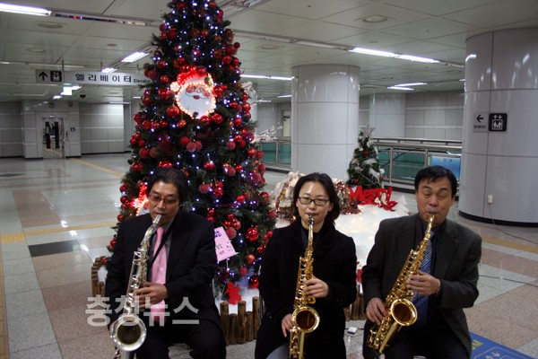 대전도시철도 대전역(역장 이무관) 역무실 앞에 지난 3일 대전제일교회가 꾸며놓은 크리스마스 트리가 등장해 오가는 고객들의 눈길을 끌고 있다.