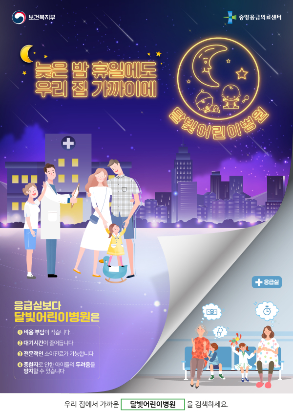 달빛어린이병원을 이용하면 응급실보다 대기시간과 비용 부담을 줄이고 전문적인 소아진료를 받을 수 있으며, 중환자로 인한 아이들의 두려움을 방지할 수 있는 장점이 있다.