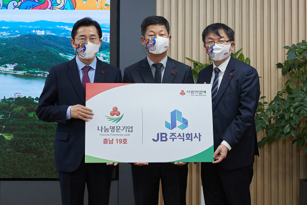 JB주식회사는 지난 3년간 충남사회복지공동모금회에 3억 원 이상을 기부하고 기업사회공헌의 바람직한 롤모델을 제시하며 이날 충남 19호, 아산 1호 나눔명문기업에 이름을 올렸다.