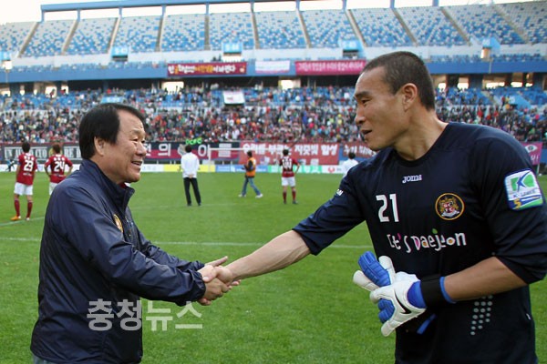 ▲ 염홍철 대전시장이 시티즌의 전설적인 선수 최은성 선수와 악수를 하고 있다.