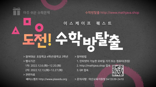 [충청뉴스 박동혁 기자] 충청남도아산교육지원청은 오는 27일까지 초4~중3 학생을 대상으로 기초학력 회복 지원을 위한 ‘지능형 수학 방탈출’ 행사를 온라인으로 진행한다고 8일 밝혔다.